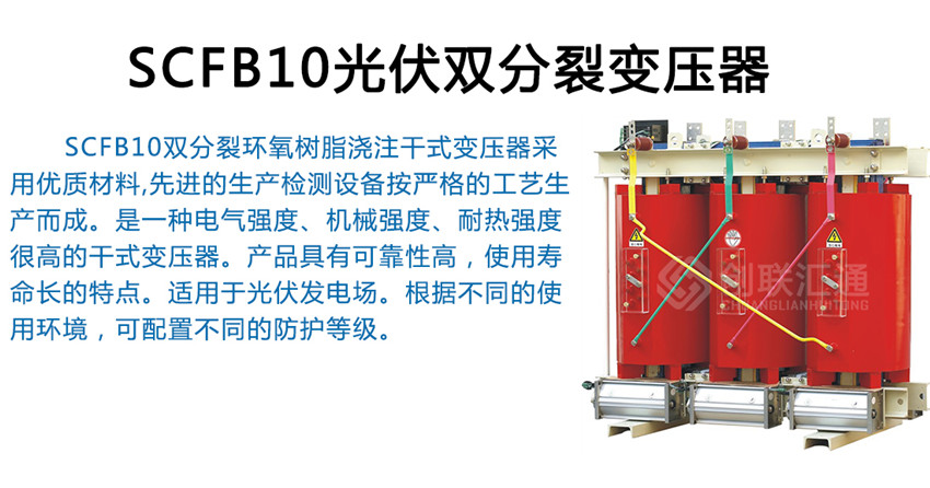 SCFB10雙分裂環(huán)氧樹脂澆注干式變壓器采用優(yōu)質(zhì)材料,先進(jìn)的生產(chǎn)檢測設(shè)備按嚴(yán)格的工藝生產(chǎn)而成。是一種電氣強度、機械強度、耐熱強度很高的干式變壓器。產(chǎn)品具有可靠性高,使用壽命長的特點。適用于光伏發(fā)電場。根據(jù)不同的使用環(huán)境,可配置不同的防護(hù)等級。